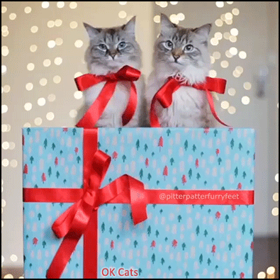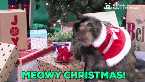 On the first day of Christmas, my beloved human gave to me A kitten in a fir tree! On the second day of Christmas, my beloved human gave to me two dogs a-kicking! On the third day of Christmas, my beloved human gave to me three fowls a-treating! On the fourth day of Christmas, my beloved human gave to me four presents a-gifting! On the fifth day of Christmas, my beloved human gave to me five hugs a-cuddling!