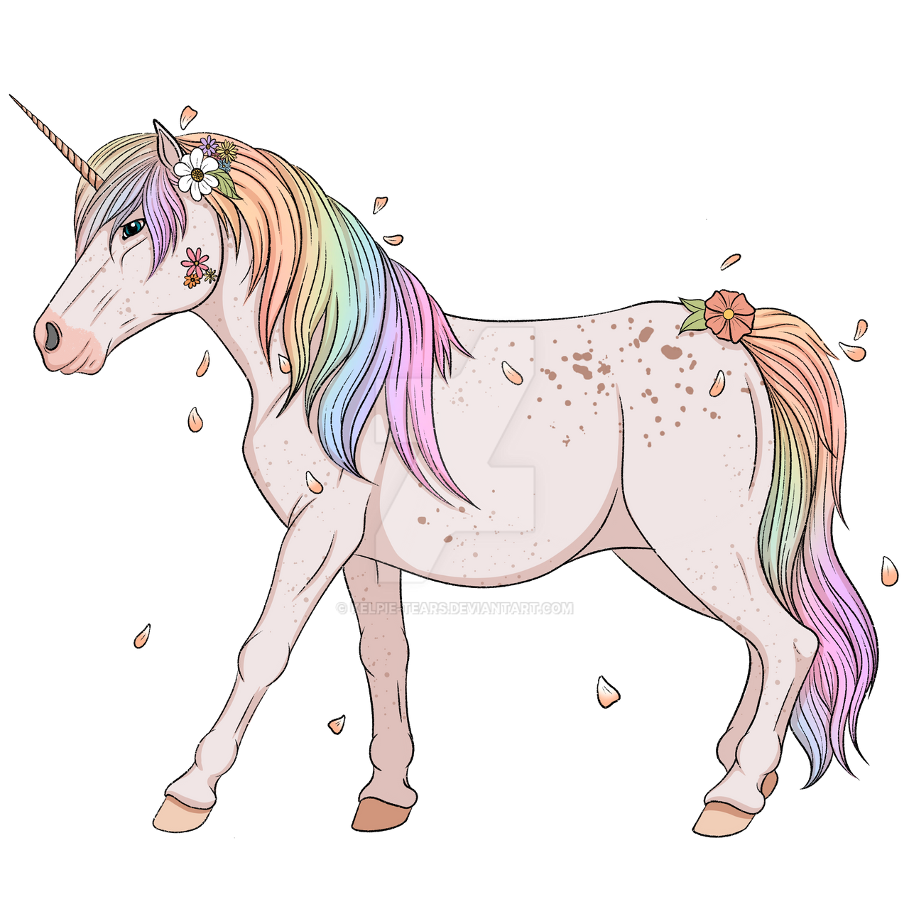 Oh he's so cute! The general shape is perfect. But can you delete all the petals? I know I said a flower on the cheek, but please delete that one. I do love the two on the mane and tail tho. :) Please make the body a lot more white? Change the muzzle to white too, but the hooves are fine that color. I know I'm a pain. I'm sorry.