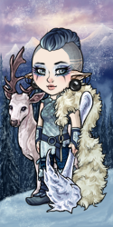 However, it all changed one winter. Frisha's icy abilities exceeded her potential and became nearly uncontrollable. Her dearest tried to help but she became distant to avoid hurting him. That is until he reached out to comfort her, Frisha unintentionally froze his entire arm. Shocked to see Frisha in this state, he left without a word. Consequently, Frisha feels intense remorse for what she's done to her dearest and made refuge on the frosty mountaintops to see when her beloved would come back; withdrawing herself from everything she found enjoyable. With her ability becoming out of control, she created her own winter climate strong enough to affect the lower green valleys miles away from the mountains.