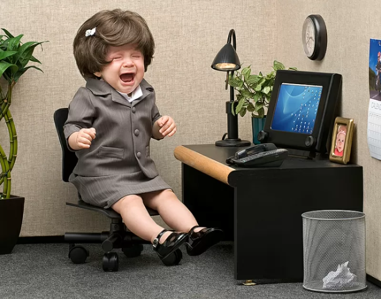“No, no, no, no, no! I’ve been assigned a cubicle without a keyboard and mouse again!”