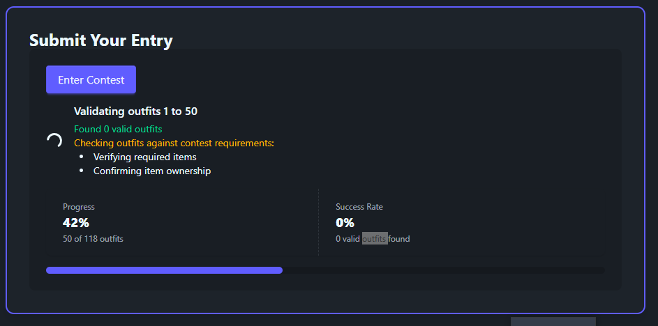 Trying to enter the Crowing Glory contest and as soon as I click Enter Contest, this pops up and hangs there for... well, until I close it, I guess. I tried setting my outfit to private then back to public like you suggested, but that didn't help. It's like it's stuck on validating the first batch? Idk. Maybe it has something to do with the fact that most of my HAs are set to unlisted (that must be by default I guess or something I set a long time ago)? I assume the 118 is just public outfits because I have over 500 outfits total.