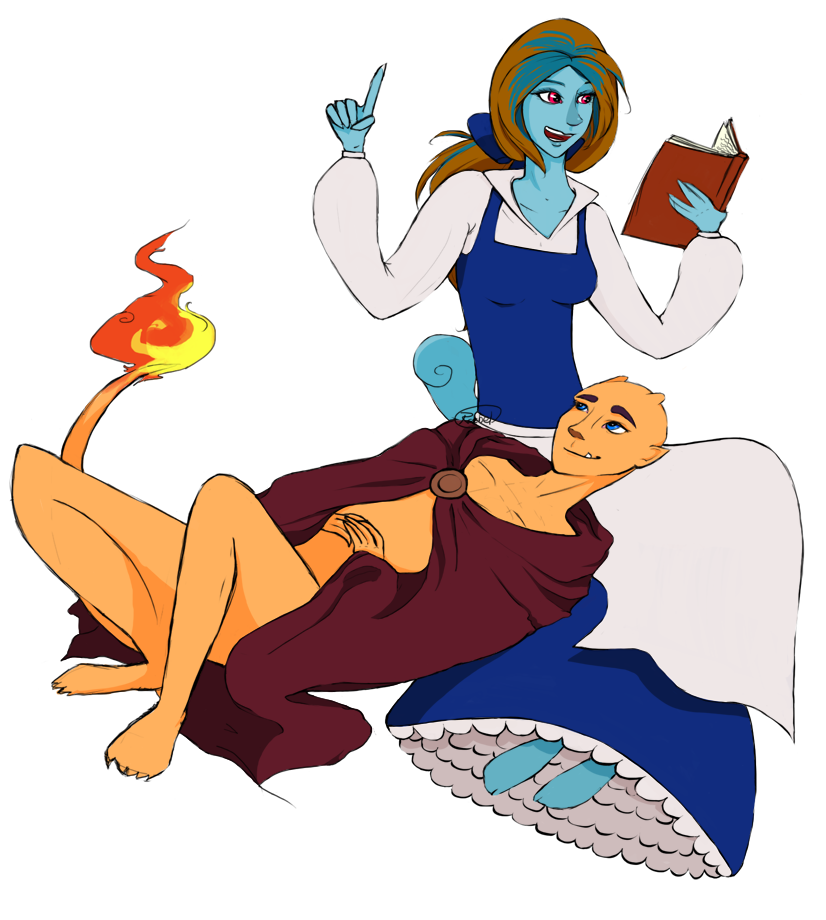 I will pay 5 mil for a flat colour of an anthro/gijinka Pokemon couple, if you're willing to do so. A Charmander wearing the cloak of the Beast, lying with his head on a Squirtle dressed as Belle who's reading him a book. If that's too restrictive of a pose, I do understand and I'd like to work something out, because I really like the sketchy, yet clean feel of your work.