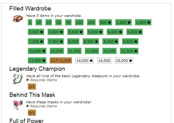 So woah, I have 217 items in my wardrobe, but I was just hit with a huge amount of achievements without earning it. It has me all the way up to having over 13,000 items in my wardrobe, and besides not earning it, it gave me all the items that you would get for reaching those points. It's just sitting in my inventory, I don't know what this is. o-o