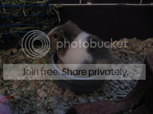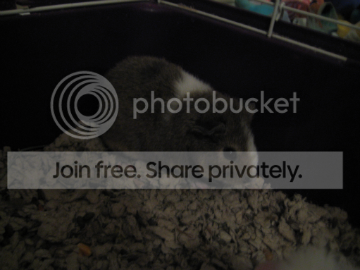 But anyway, her name is Muffin (my idea) and she's a little ball of gray-brown speckled and white fur. She's getting along fine with my oldest pig, Nibbles, but Dusty, the other pig, seems to like to chase her around the cage and scare her, so I've taken to sticking Dusty in the igloo whenever she scares Muffin. :o