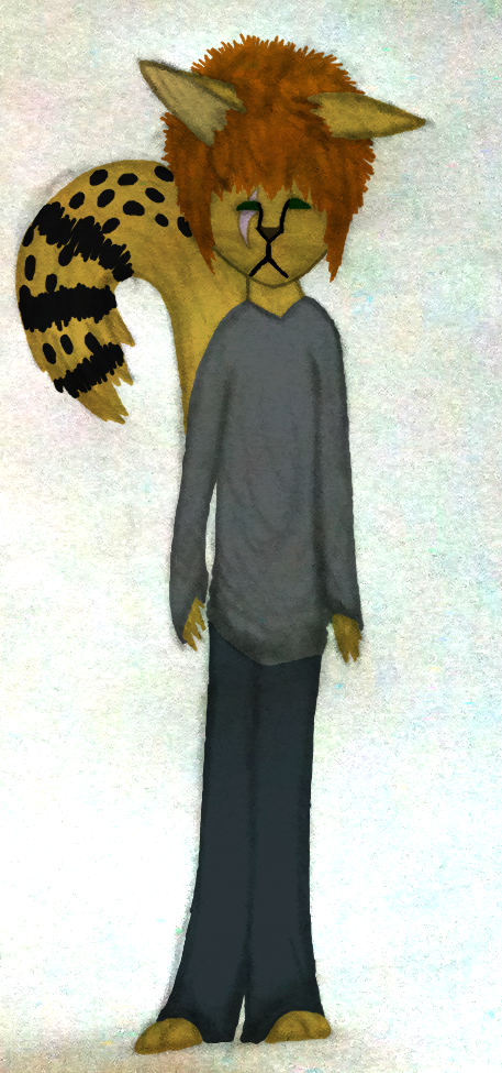 Charactor: Experiment Name: Torolf Cawl Nickname: Tor Species: Thylacinus http://tricomts.files.wordpress.com/2010/10/thylacinus.jpg Age: 16 Personality: He is fairly shy and keeps to himself when meeting new people but he is not afraid to have a conversation with new people. He is usually quite playful and loves to play tricks and playfully tease others once he gets to know them and there personality. He rarely has hatred towards others and is very forgiving. Once he gets close to someone he can be very loyal and loving. He is also easily startled and frightened. Likes: fruit, vegetables, playing, relaxing, mornings, hugs Dislikes: being stressed, meat, crowds, misleading people Appearance: He has sandy Blonde hair with brown-red streaks mostly at the front of his hair. He has the round ears of a Thylacinus replacing his human ears. His eyes are an amber orange-brown. He has the long stiff tail of the Thylacinus as well. He has the stripes of the Thylacinus on his tail but they continue onto his lower back, and are in a dark chocolate brown colour. He has tan skin; with some markings on his face from the Thylacinus DNA, Such as an off-white border around his eyes that get thicker at the bottom of his eye and at the top. He is not very strong and does not have a lot of muscle; he stands at a height of 5â€9. His teeth are pointed like that of a canine and his heels are raised higher in his legs to be similar to canine’s hind legs, his feet are more paw like as well. His hands and feet have black claws like the Thylacinus. Clothing: He wears a sleeveless black loose cowl neck shirt. Around his neck is a tight threaded necklace, with amber stones intertwined in the thread to make a pattern. Over the cowl-neck he wears a light purple hoody that is yellow on the inside, ontop of the hoody he wears a light grey jacket. His pants are worn out and black that are frayed at the bottom. His shoes are light purple converse. (Again ill try to draw a visual ref as soon as possible) Other: He has certain abilities due to the Thylacinus DNA. For instants he can open his Jaws up to 120degrees, and his jaws are very muscular and powerful. He can not run very fast but he has lots of stamina. He has a strong sense of hearing and sight, and can also see in the dark.