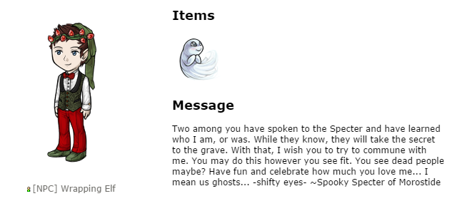 <p>Two among you have spoken to the Specter and have learned who I am, or was. While they know, they will take the secret to the grave. With that, I wish you to try to commune with me. You may do this however you see fit. You see dead people maybe? Have fun and celebrate how much you love me... I mean us ghosts... -shifty eyes- ~Spooky Specter of Morostide