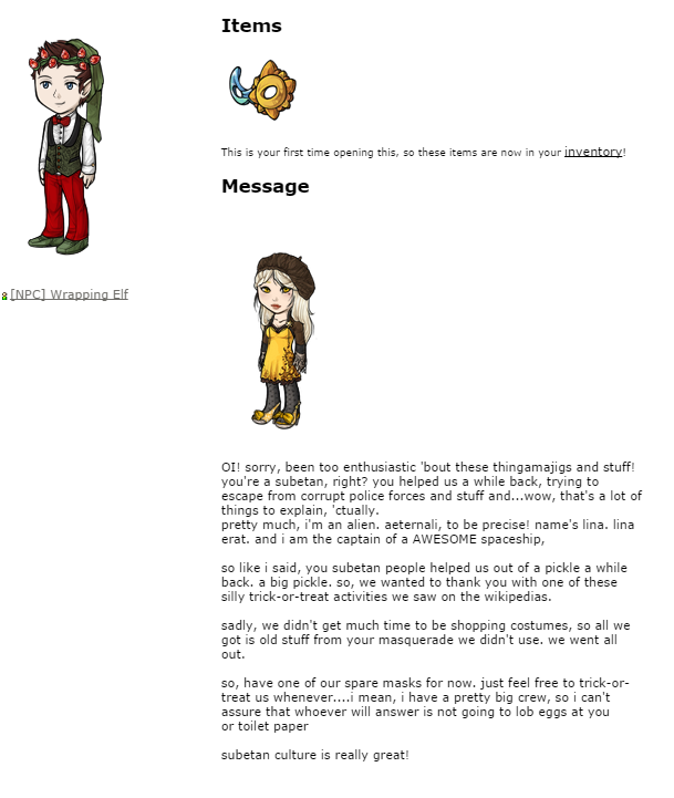 OI! sorry, been too enthusiastic 'bout these thingamajigs and stuff! you're a subetan, right? you helped us a while back, trying to escape from corrupt police forces and stuff and...wow, that's a lot of things to explain, 'ctually. pretty much, i'm an alien. aeternali, to be precise! name's lina. lina erat. and i am the captain of a AWESOME spaceship,