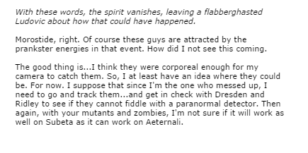 The good thing is...I think they were corporeal enough for my camera to catch them. So, I at least have an idea where they could be. For now. I suppose that since I'm the one who messed up, I need to go and track them...and get in check with Dresden and Ridley to see if they cannot fiddle with a paranormal detector. Then again, with your mutants and zombies, I'm not sure if it will work as well on Subeta as it can work on Aeternali