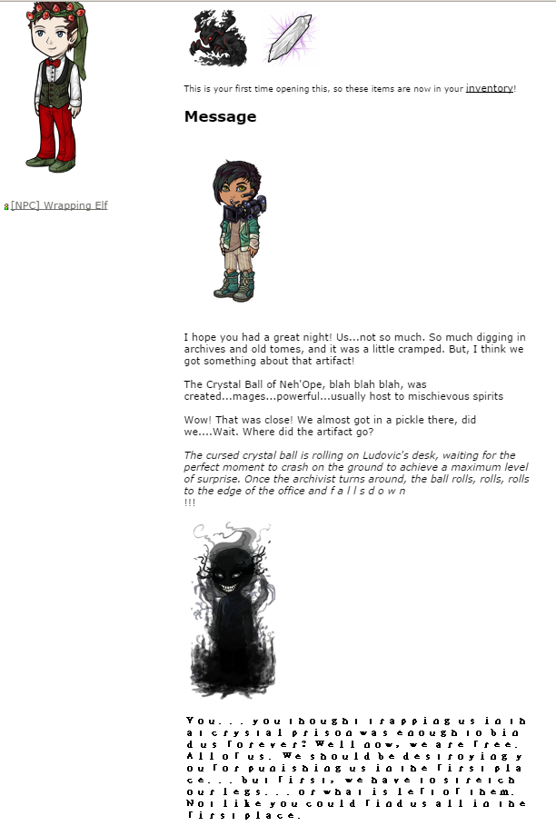 <p>The Crystal Ball of Neh&;Ope, blah blah blah, was created...mages...powerful...usually host to mischievous spirits</p>