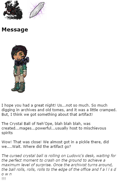 <p>The cursed crystal ball is rolling on Ludovic&;s desk, waiting for the perfect moment to crash on the ground to achieve a maximum level of surprise. Once the archivist turns around, the ball rolls, rolls, rolls to the edge of the office and f a l l s d o w n