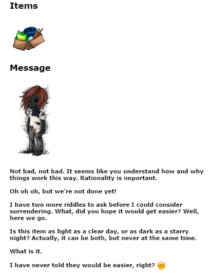 I have two more riddles to ask before I could consider surrendering. What, did you hope it would get easier? Well, here we go.