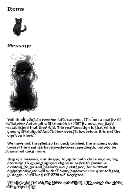 <p>I̡t̀ ̸i͢s o̡u͞ŕ mis̵sio̴n,̀ our desi͜r̵e, t͝o ̡u͢n͝ite bo̴t͡h͟ cl͠ans as ̨one, fo͢r͜ ͏ete̶rn͘it̷y.̸ T͞o ̀g̡o ̡an͢d ̨sp̨re̢ad c͝h͢a͟o̕s͠ in o̵rd̸ȩr ҉t͠o c҉ont̴i͝nue e̶xisti̷n͠g, ҉t͠o ͜g̨o a̴n͠d͡ ͜p͡ro̸lon̛g o͏u̷r ̡exìst͡e͜n̵c̵e, fo̵r wit́h̛o̴u͏t́ di͟sh̨a̵r͜mońy,̷ ̡w̵e wi̸ll̕ ҉withe͞r áw҉ay ҉an̡d ̷ne͏vȩr ̶b͘e grante͡d̷ ͜re̴s͟t ͢i̡n de͟at̛h̶.͘ ̶S̕u̶c͞h͡ was҉ th͞e̶ ͞d͞e͡a̛l̵ ͘w͡e͝ a͏cc̡e͝p̧te̶d. ̵</p>