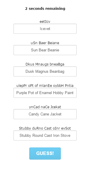 I'm suggesting that when you get the Challenge Round in the newly updated Item Scramble game that it processes your answers whether you're finished or not (because you are finished after the time limit anyway) and to not require you to always have to manually click the button.