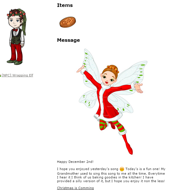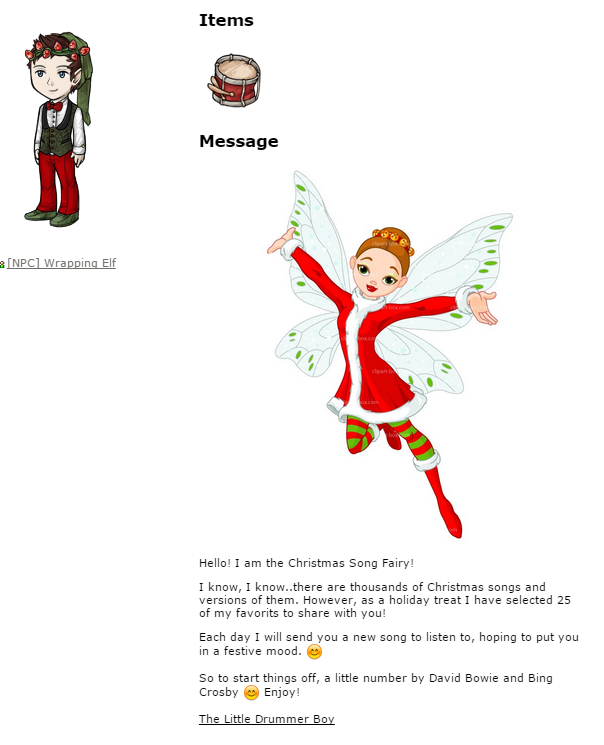 I'm lucky enough to receive the gifts of the Christmas Song Fairy as well. Gotta admit, though, I'm not a fan of Christmas music. >_> But I am a fan of the Muppets, so maybe this little fairy will be able to change my mind before the end of the month!