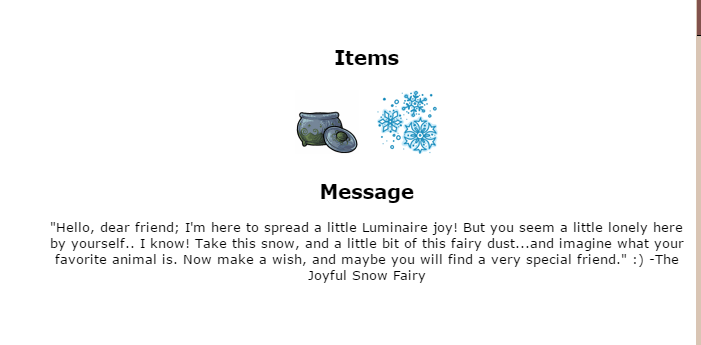 Message "Hello, dear friend; I'm here to spread a little Luminaire joy! But you seem a little lonely here by yourself.. I know! Take this snow, and a little bit of this fairy dust...and imagine what your favorite animal is. Now make a wish, and maybe you will find a very special friend." 😊 -The Joyful Snow Fairy