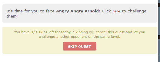 Agreeing that the skip button is way too big, especially in comparison to the button to actually challenge the opponent. Also annoyed that the quests still haven't been reset and it's well after 2am. Day 2 of manual battle quests and the staff has already forgotten it. Great planning.