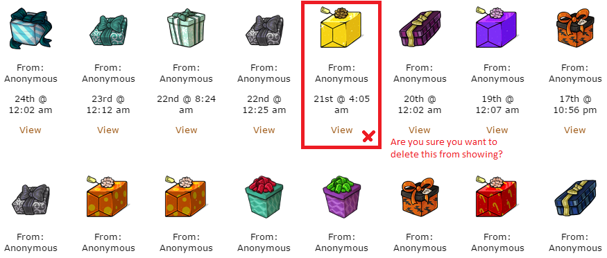Yes, yes! I've suggested this before and basically got shot down. I don't have sentimental attachment to certain gifts that were sent because someone was doing Drills' Quests*. These gifts are like the Slots Spork with no message attached or say something like "Doing Drills Quests". I'm just glad by the time the archiving of gifts came out I stopped being one of the users who allowed to be sent [junk] gifts for Drills. I still don't really care if someone does this, I just want the ability to delete the gift if I want. It's not anyone else's business but mine.