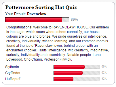 "47% Ravenclaw, 39% Hufflepuff, 63% Slytherin and 58% Gryffindor!"