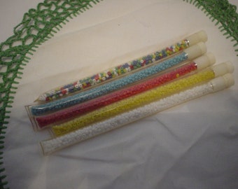 Skeins and tubes of seed beads.