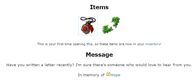 I got one, too, plus a couple of generous gifts. Thank you, Anon. I nearly lost someone very dear to me last year, and this is a lesson I've kept at the forefront of my mind ever since. I didn't know , but it sounds like everyone who did was very lucky to have known her. I'm so sorry her time was cut short, but it's users like you who keep that memory alive. <3