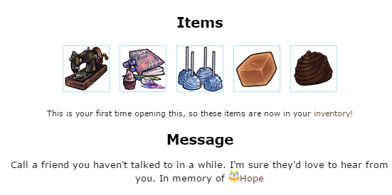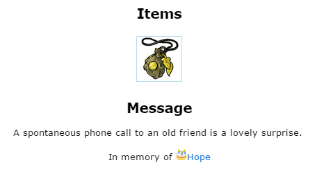 Still traveling (just finally with 4g again) so I can't copy/paste the lovely gifts and but what a perfect way to honor such a loving and generous person. Thank you for the waem thoughts and gifts ;___;