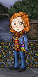 She prefers skirts and the particular one she's wearing is one of her favorites, but she figured they wear skirts in the muggle world, too, so it's okay. She has a shall in case she gets cold, but then also a scarf because one time she went to London and everybody was wearing scarves so apparently that's just the thing to do.