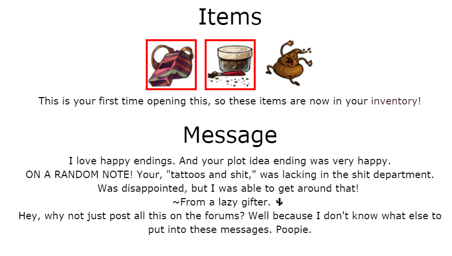 Message Hiiiiii~ teeheeheehee -flails around- Byyye~ ? ~From a lazy gifter.?