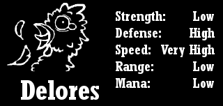 "Delores has always been my favourite. She won't really hurt you too much unless you guys tick her off. But even then, I'd say that those with the low defense would need to get hit uhh, like 5 times? And you speedy guys are in for it, she's faster than you, heh! Info should pop up for you once you analyze her. Have fun! I need to go tell Doc he's gonna have fun watching this."