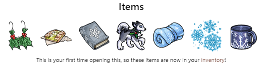 Items This is your first time opening this, so these items are now in your inventory!