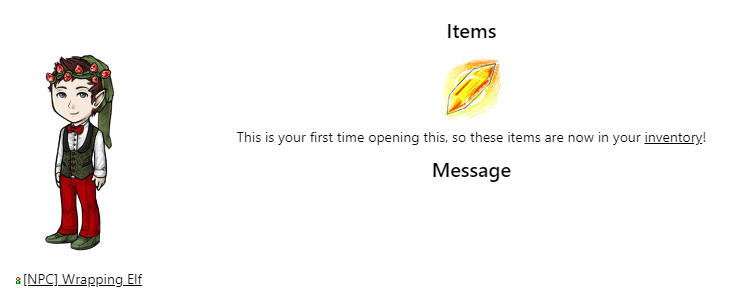 Thank you so much! Items This is your first time opening this, so these items are now in your inventory!
