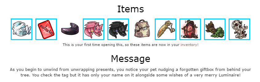 Message What's this? You find a stocking on the mantle with your name on it, looks like you forgot to open it this morning! Thank you very much for the gifts, have a Merry Luminaire!