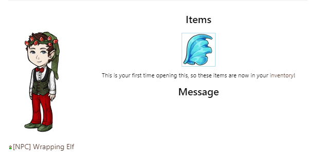This is your first time opening this, so these items are now in your inventory! Message <3