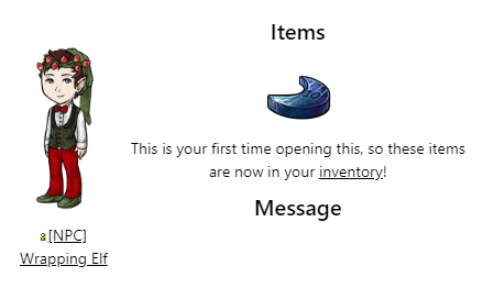 Items [Item=Mint Cocoa Gift] This is your first time opening this, so these items are now in your inventory!