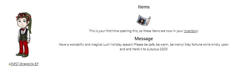 I got an anon gift box just now that included Luminaire Present Beanbag, Peppermint Brownies, and Vanilla Cocoa. I'm unsure why my gifter sent me these items, but thank you regardless. I didn't have the beanbag and I'm sure my pet Jackline will enjoy the sweets.