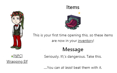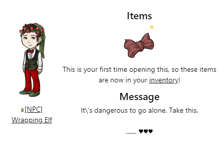 Items [Item=Broken Lovey Sugar Cookie] This is your first time opening this, so these items are now in your inventory!