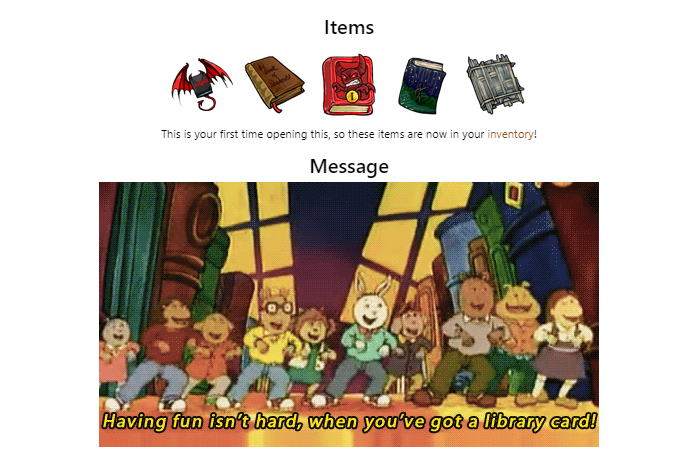 Items x6 This is your first time opening this, so these items are now in your inventory!