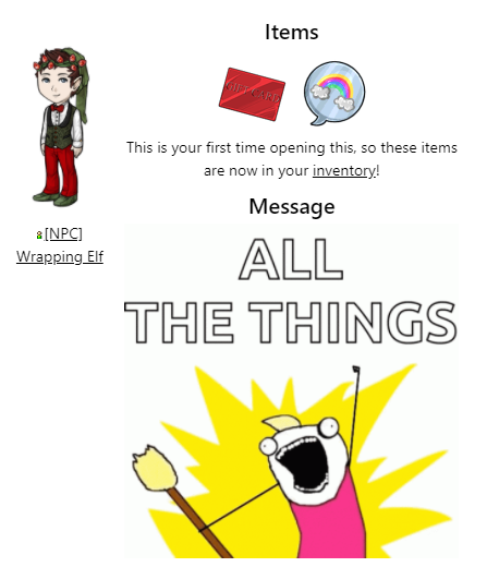 This is your first time opening this, so these items are now in your inventory! Message
