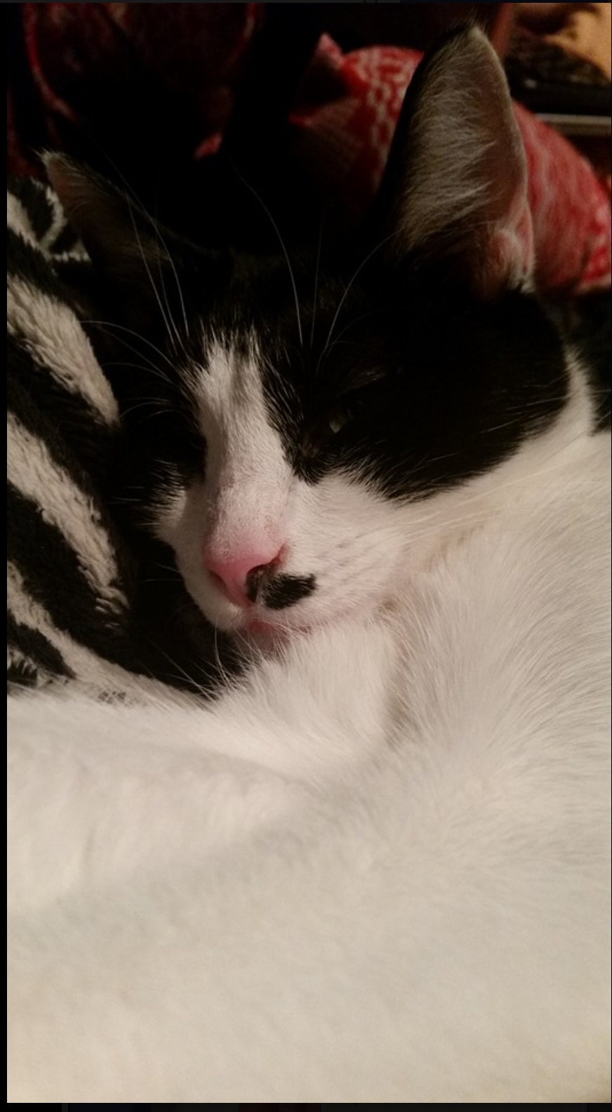 We have a kitten (she is no longer an actual kitten) named Eleanor Rigby. We tend to just call her Rigby or Pigby or Rig-Pig. She's a sweet little black and white boop of a baby with a little pink nose. She isn't much for being held for long amounts of time, but she definitely likes attention. She chooses you by coming up, gently touching your arm with her paw, and softly screaming for affection. She never fails to make us smile. Also, she was a shelter kitty at 10 months old when we got her back in Oct 2015