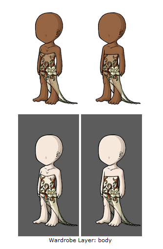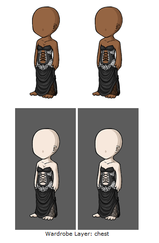 In this example, the dress seems to resemble clothing on a paper doll rather than being worn by our avatars. It does not have any flow or definition, but is instead simply flat against the avatar.