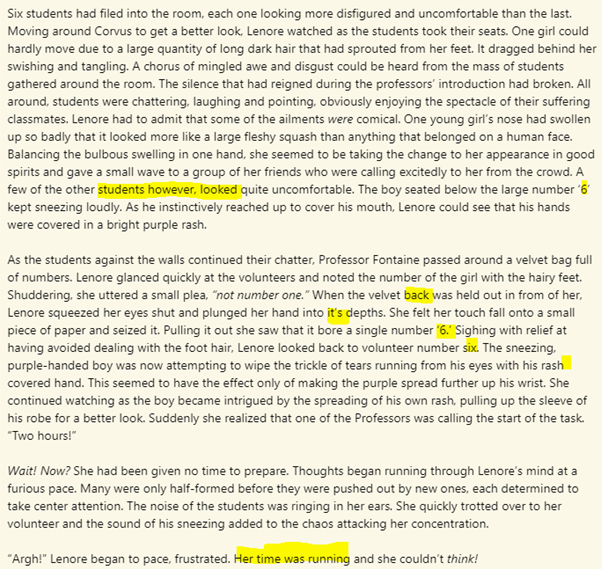Six students had filed into the room, each one looking more disfigured and uncomfortable than the last. Moving around Corvus to get a better look, Lenore watched as the students took their seats. One girl could hardly move due to a large quantity of long dark hair that had sprouted from her feet. It dragged behind her swishing and tangling. A chorus of mingled awe and disgust could be heard from the mass of students gathered around the room. The silence that had reigned during the professors’ introduction had broken. All around, students were chattering, laughing and pointing, obviously enjoying the spectacle of their suffering classmates. Lenore had to admit that some of the ailments were comical. The hairy-footed girl’s nose had swollen up so badly that it looked more like a large fleshy squash than anything that belonged on a human face. Balancing the bulbous swelling in one hand, she seemed to be taking the change to her appearance in good spirits and gave a small wave to a group of her friends who were calling excitedly to her from the crowd. A few of the other students, however, looked quite uncomfortable. The boy walking toward the seat that was placed below the large number ‘6’ kept sneezing loudly. As he instinctively reached up to cover his mouth, Lenore could see that his hands were covered in a bright purple rash.