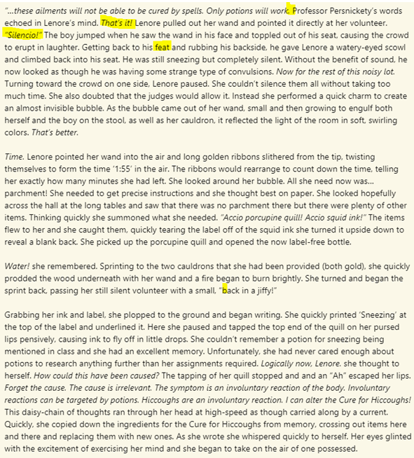 Grabbing her ink and label, she plopped to the ground and began writing. She quickly printed ‘Sneezing’ at the top of the label and underlined it. Here she paused and tapped the top end of the quill on her pursed lips pensively, causing ink to fly off in little drops. She couldn’t remember a potion for sneezing being mentioned in class and she had an excellent memory. Unfortunately, she had never cared enough about potions to research anything further than her assignments required. Logically now, Lenore. she thought to herself. How could this have been caused? The tapping of her quill stopped and and an “Ah” escaped her lips. Forget the cause. The cause is irrelevant. The symptom is an involuntary reaction of the body. Involuntary reactions can be targeted by potions. Hiccoughs are an involuntary reaction. I can alter the Cure for Hiccoughs! This daisy-chain of thoughts ran through her head at high-speed as though carried along by a current. Quickly, she copied down the ingredients for the Cure for Hiccoughs from memory, crossing out items here and there and replacing them with new ones. As she wrote she whispered quickly to herself. Her eyes glinted with the excitement of exercising her mind and she began to take on the air of one possessed.