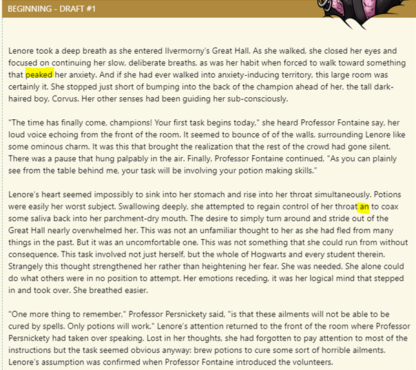 "The time has finally come, champions! Your first task begins today," she heard Professor Fontaine say, her loud voice echoing from the front of the room. It seemed to bounce of of the walls, surrounding Lenore like some ominous charm. It was this that brought the realization that the rest of the crowd had gone silent. There was a pause that hung palpably in the air. Finally, Professor Fontaine continued, "As you can plainly see from the table behind me, your task will be involving your potion making skills.”