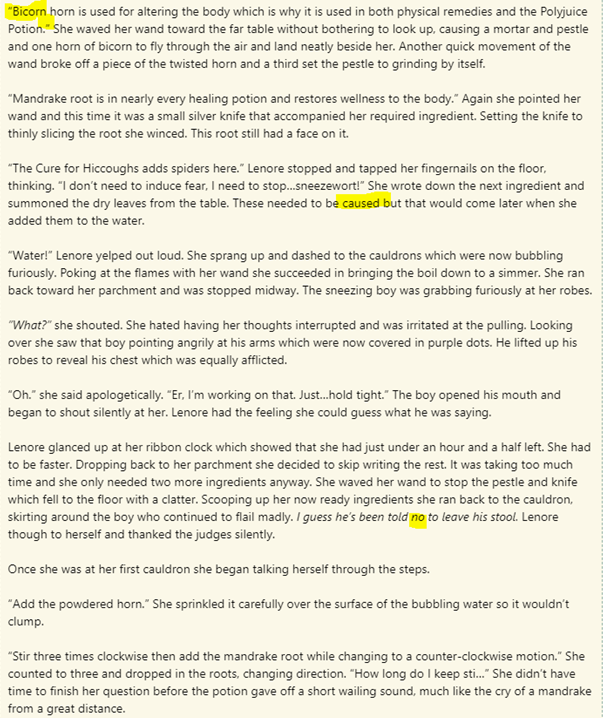 “Water!” Lenore yelped out loud. She sprang up and dashed to the cauldrons which were now bubbling furiously. Poking at the flames with her wand she succeeded in bringing the boil down to a simmer. She ran back toward her parchment and was stopped midway. The sneezing boy was grabbing furiously at her robes.