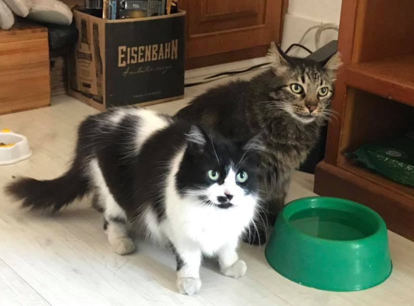 The B&W is a female and the tabby is a male. Both are around 10 years old. The Tabby is a super lovable baby, while the B&W is afraid of... basically anything and doesn't stand to be touched at all. I think I managed to pat her like..... 4 times in 4 years? LOL