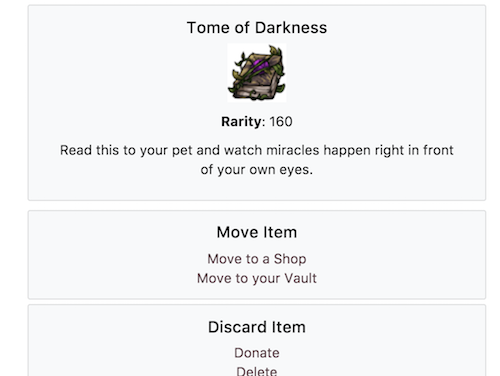 Iβm also (finally) working on the Item Menu page! Whatβs the item menu page? Itβs when you click an item in your inventory and get all the options to what you want to do with that item (feed it to a pet, move to treasure, etc). Iβm going to show you a few sneak peaks real quick. This is not how the final is going to look. Thereβs still a lot of work to be done, but I want to show a few things: