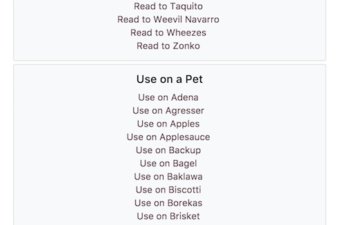 This is to show we are going to in some way separate between uses; this is the example of a tome of darkness where you can use it on a pet or read it to a pet. Right now, I have all the pets still listed out (gross), but and I are brainstorming ways to make this less annoying (especially for those like me that have a billion pets). The big thing is that each section will be clearly labeled, like βCollectionsβ for beanbags/plushies/etc, βRead to a Petβ, βFeed to a Petβ etc. No more having all uses in one section! :)