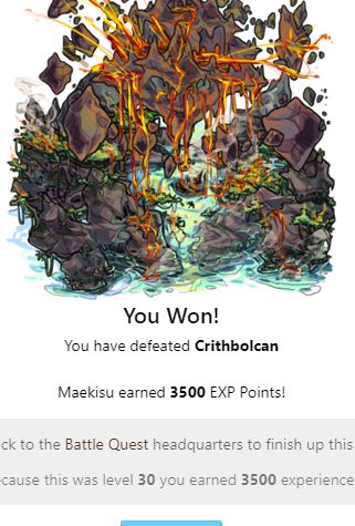 Allivia earned 3500 EXP Points! Head back to the Battle Quest headquarters to finish up this quest! Because this was level 30 you earned 3500 experience!
