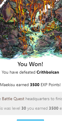 You Won! You have defeated Crawbeast You won a(n) Impossible token to use in the battle shop! Elyviia earned 3500 EXP Points! Head back to the Battle Quest headquarters to finish up this quest! Because this was level 30 you earned 3500 experience!