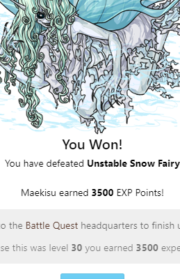 You Won! You have defeated Unstable Snow Fairy You won a(n) Impossible token to use in the battle shop! Elyviia earned 3500 EXP Points! Head back to the Battle Quest headquarters to finish up this quest! Because this was level 30 you earned 3500 experience!