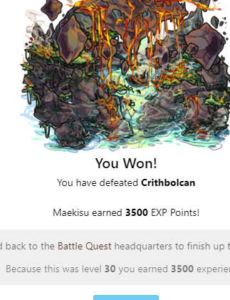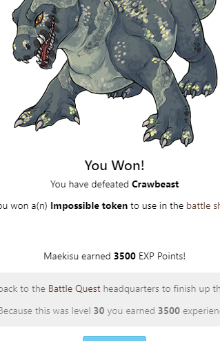 You Won! You have defeated Crithbolcan You won a(n) Impossible token to use in the battle shop! widowmaker earned 3500 EXP Points! Head back to the Battle Quest headquarters to finish up this quest! Because this was level 30 you earned 3500 experience!